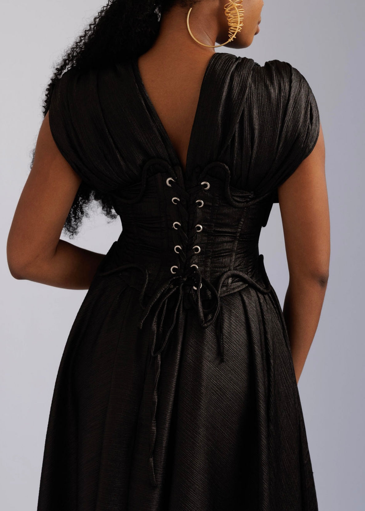 Elevate your look with this dreamy maxi dress. Featuring a flowy silhouette, a corset-style midsection, and delicate cording details, the perfect blend of elegance and charm.